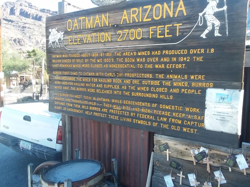 Then it was onto Oatman, but first we had to cross Sitgreaves Pass. We found a pullout as the top of the pass, and I got out of the car and found a cache some 400 feet from where we parked. I saw burro scat and burro hoofprints but no actual animals.